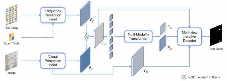 - 基于ViT+DCT的篡改检测(CVPR 2023):该方法结合了视觉Transformer(ViT)和离散余弦变换(DCT),有效提升了对图像篡改的检测能力,特别是在无法察觉的无痕篡改检测上取得了显著进展。该方法引入了频率感知头,使模型在视觉特征不显著时也能够识别篡改痕迹。