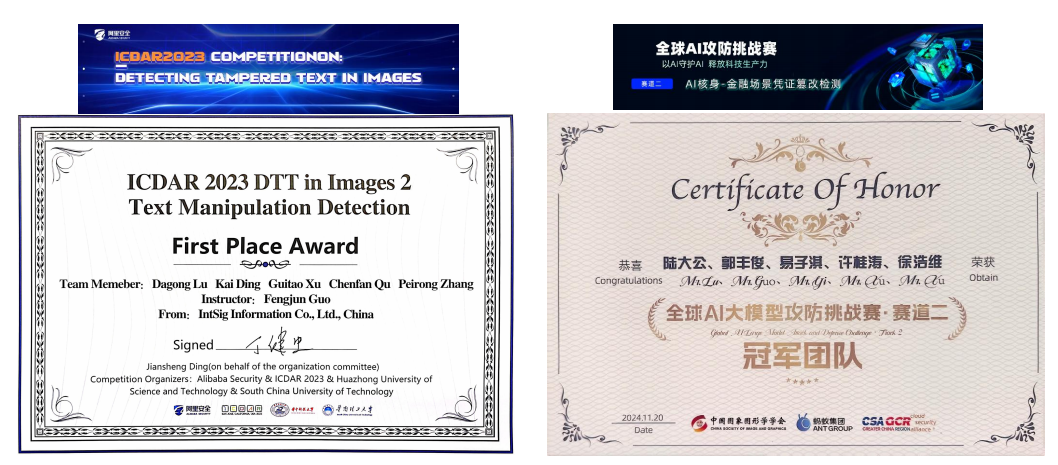 - 2024年 全球AI攻防挑战赛:围绕AI核身和金融场景凭证篡改检测展开,吸引了1100+支队伍参与,为金融场景中的图像篡改检测提供了技术对抗的平台。