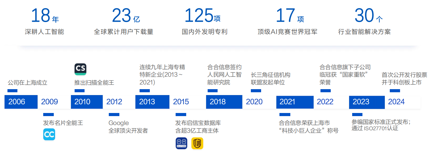 通过其在智能文字识别和商业大数据领域的核心技术,合合信息不断推出创新的数字化与智能化服务,助力全球企业和个人用户提高效率与安全性。公司已推出的多款深受全球用户喜爱的C端产品,累计下载量超过23亿,月活跃用户达到1.5亿,这也体现了合合信息在全球范围内的影响力和技术创新能力。