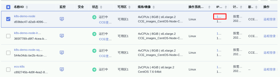 ➤ 步骤 5 通过华为云控制台查看其中一个kubernetes Node绑定的公网地址。