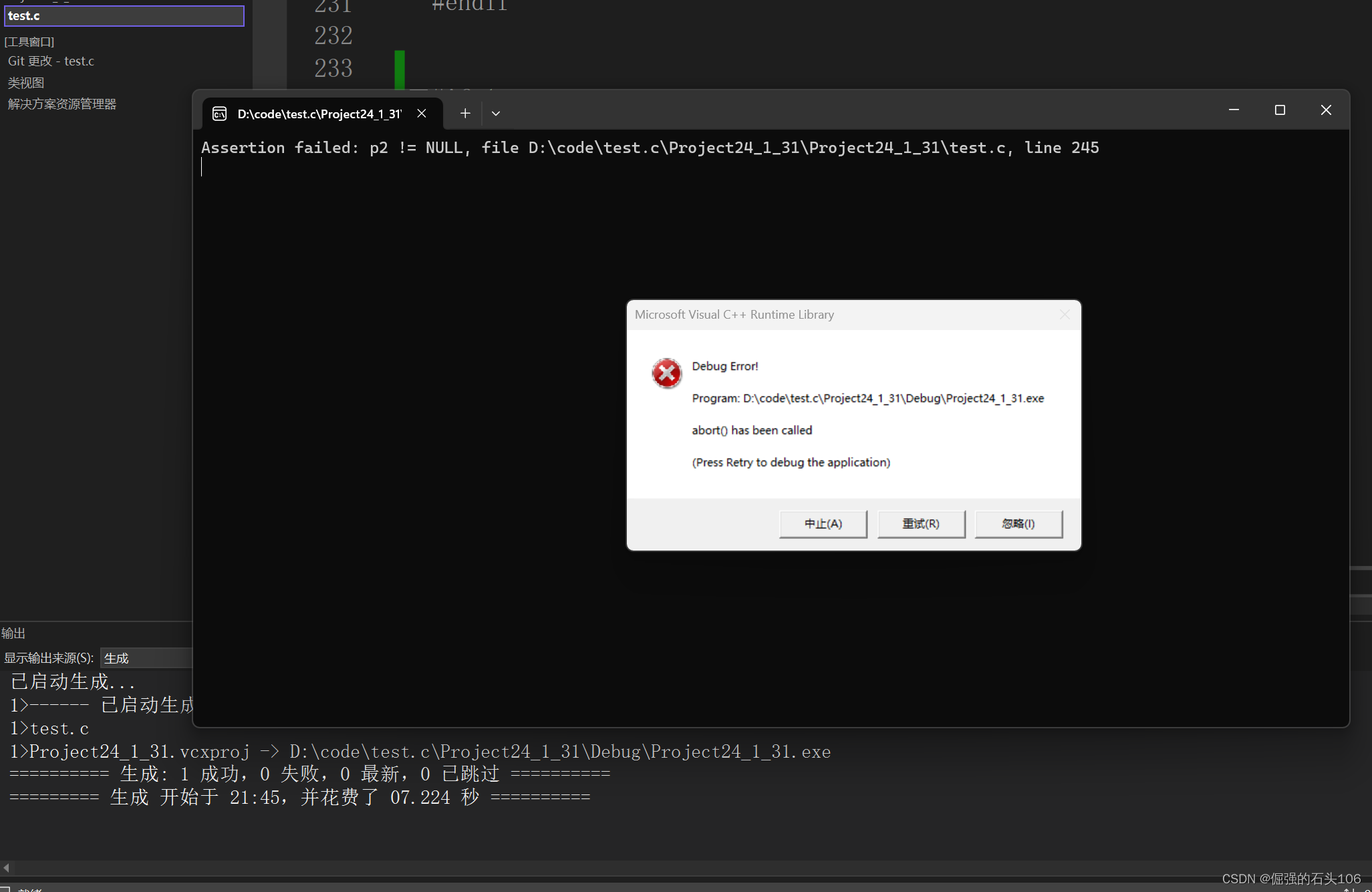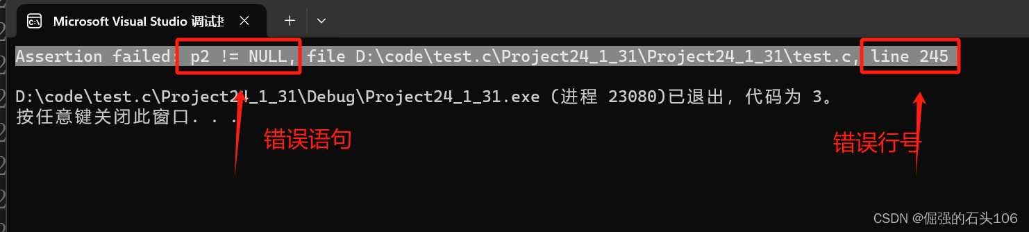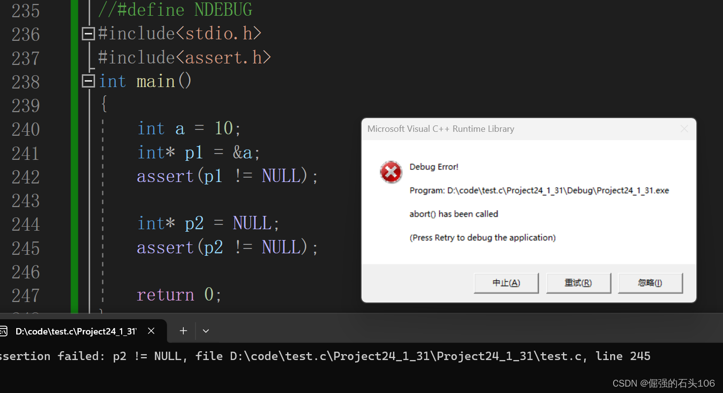 如果该表达式为假(返回值为零), assert() 就会报错,在标准错误流 stderr 中写入⼀条错误信息,显示没有通过的表达式,以及包含这个表达式的⽂件名和行号。(而这也正是使用assert的优势,它能自动标识文件和出问题的行号)