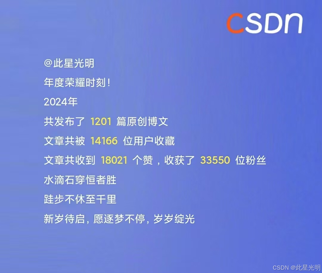 一年一年又一年,飞逝仅在一转眼。不知不觉中2024年已经结束,回溯这一年中种种依旧历历在目,真是又紧张而充实的一年。在这一年里我在全年365天中有351天都在学习,总共创作了1201篇技术博客,原力值也来到了32041,收获了33550粉丝,14166收藏和18021个点赞,对于我这个很小的领域来说,我已经非常欣慰了。作为一个认真负责的博主,我认真恢复了300+评论,不包含私信。同时,拿到了1项专利,另外还出版了一本书,有一本书还在审查,还有两篇文章正在审稿。作为一个遥感测绘类的技术小博主,总是在我的领域中一次次不断需按照行业方向,为科技前沿推陈出新,写出最好的技术博客来帮助更多人实现技术的升级和迭代更新。