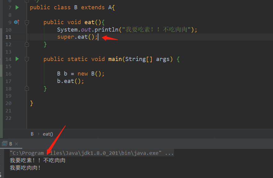 是不是输出了自定义的内容啊。那如果又想调用父类的eat()方法呢?那像这种情况,怎么区分调用呢?也不怕可以使用特殊的关键字super来解决这个问题。