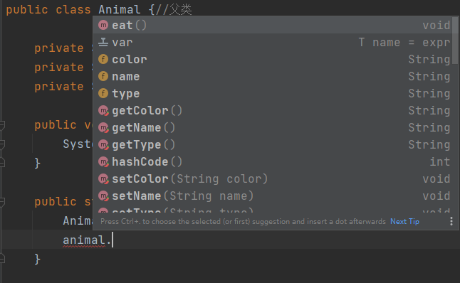 那我们要调用Animal类,我们就应该创建一个Animal对象,通过对象点(animal.xxx)来获取其属性或者方法,具体演示如下: