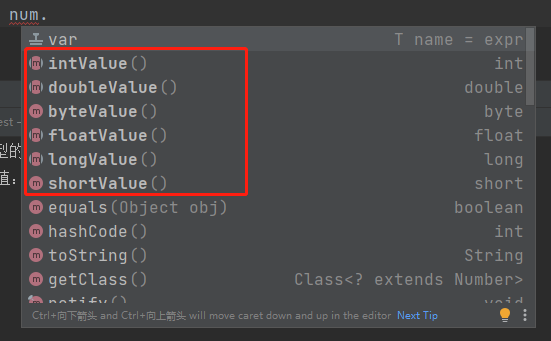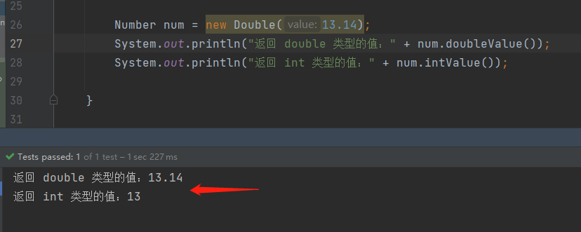 对于抽象类而言,不能直接被实例化,要实例化其具体的子类才行。但子类等可以使用父类的所有方法。而且为Number的子类有提供将表示的数值转换为对于基础数据类型的方法,共有6个,比如对于int ,有intValue()方法,返回一个int类型的值,再比如double Double(),返回一个double类型的数值类型。代码演示:
