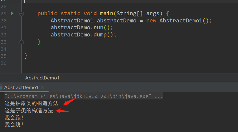 发现父类及子类构造方法都执行了,这就说明抽象类中的构造方法就是用来初始化的。