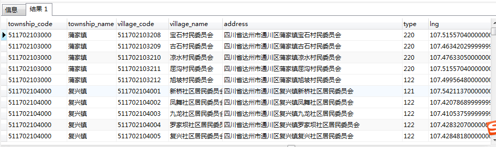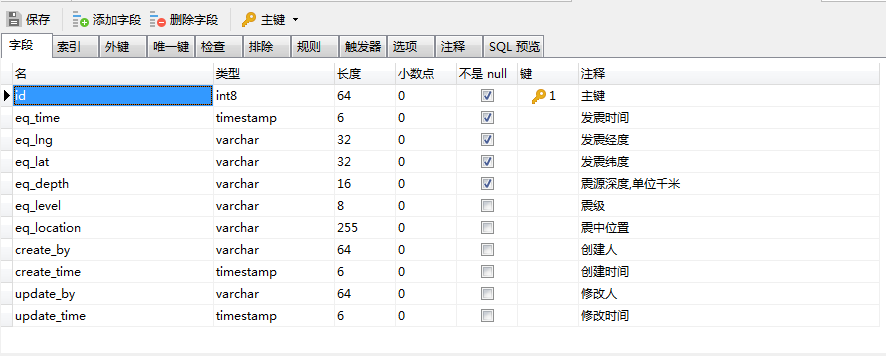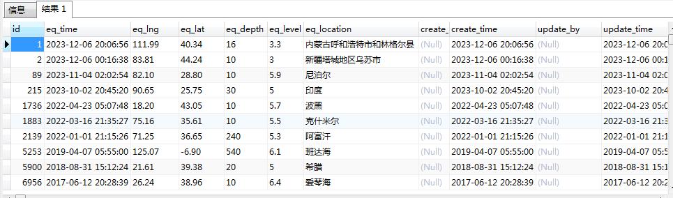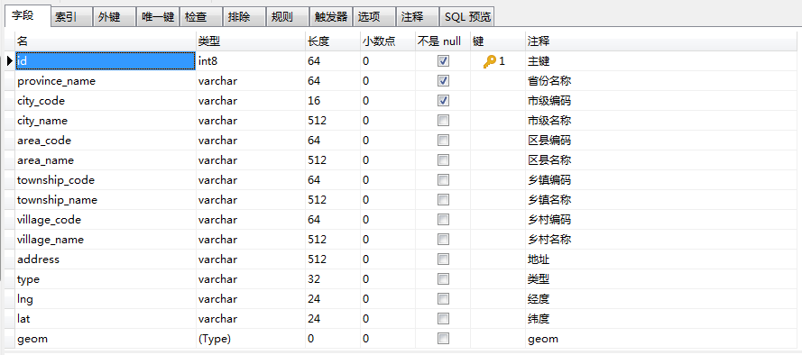 由于是WebGIS项目,因此需要叠加影像底图、地震基础信息、全国行政村点位信息。其中影像底图采用xyz瓦片的形式组织,已经在本地离线化。而地震基础信息、全国行政点位信息采用PostGIS数据库进行存储,其数据已经由后台程序进行存储至空间数据库中。下面对这两张表和具体数据进行简要介绍。