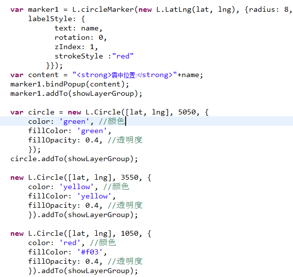 这里使用ajax的方式,由前端将地震发生的经纬度作为接口参数传递到后台,后台经过计算,将不同范围的数据返回到前端,包括经纬度位置,还有距离震中的距离、行政区名称等等。再由前端动态绘制相应的界面。关键代码如下: