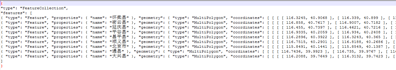 将beijing.json数据使用文本文件打开,可以看到以下结果,同时需要进行处理的还有行政区划的边界数据。