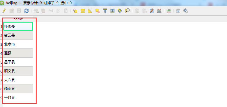 在Qgis中,打开属性表可以看到以下的数据(ps:这里的数据不准确,仅供参考)。这里的数据比较老,与现行的行政区划是不一致的,同时北京市城区没有进行更详细的划分。