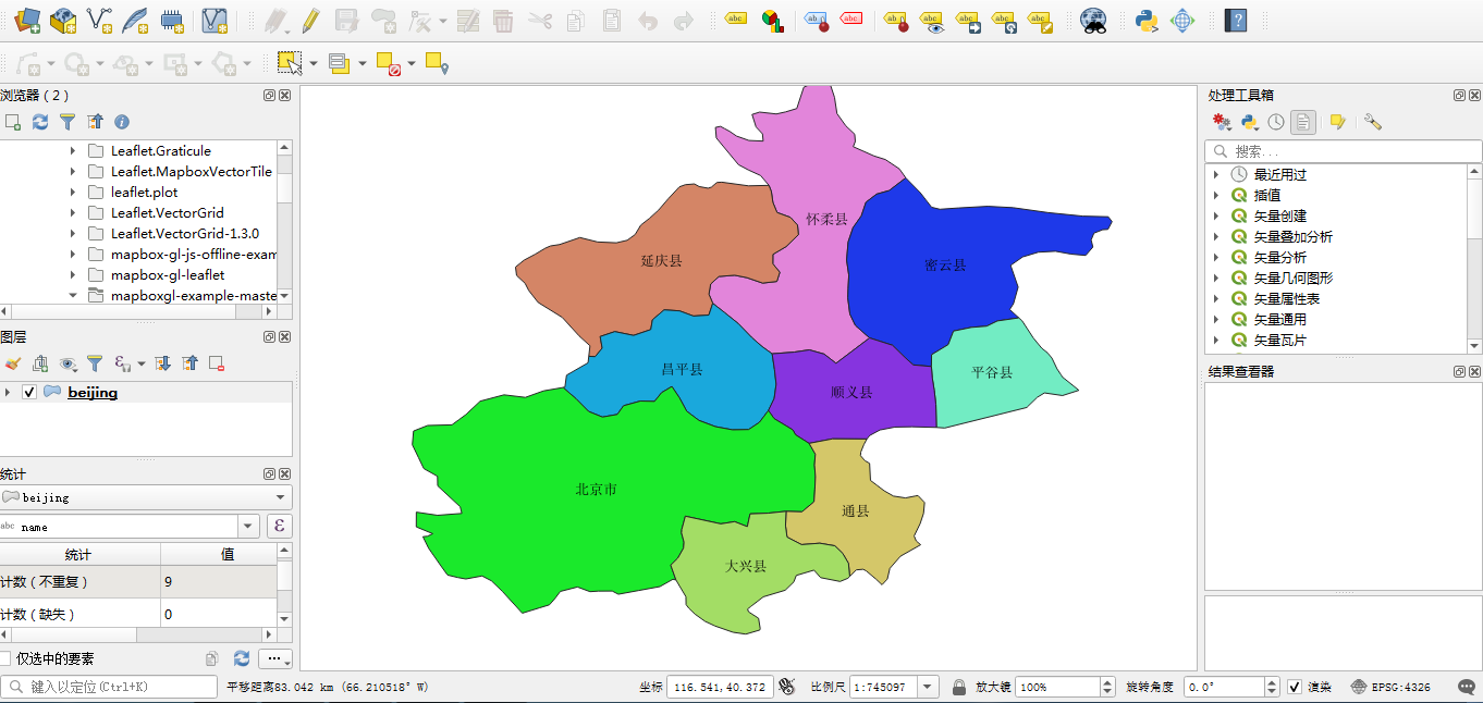 上面本人已经默认进行中文标注以及颜色渲染,不过这是在qgis中进行标注实现的。下面来看一下数据的属性。