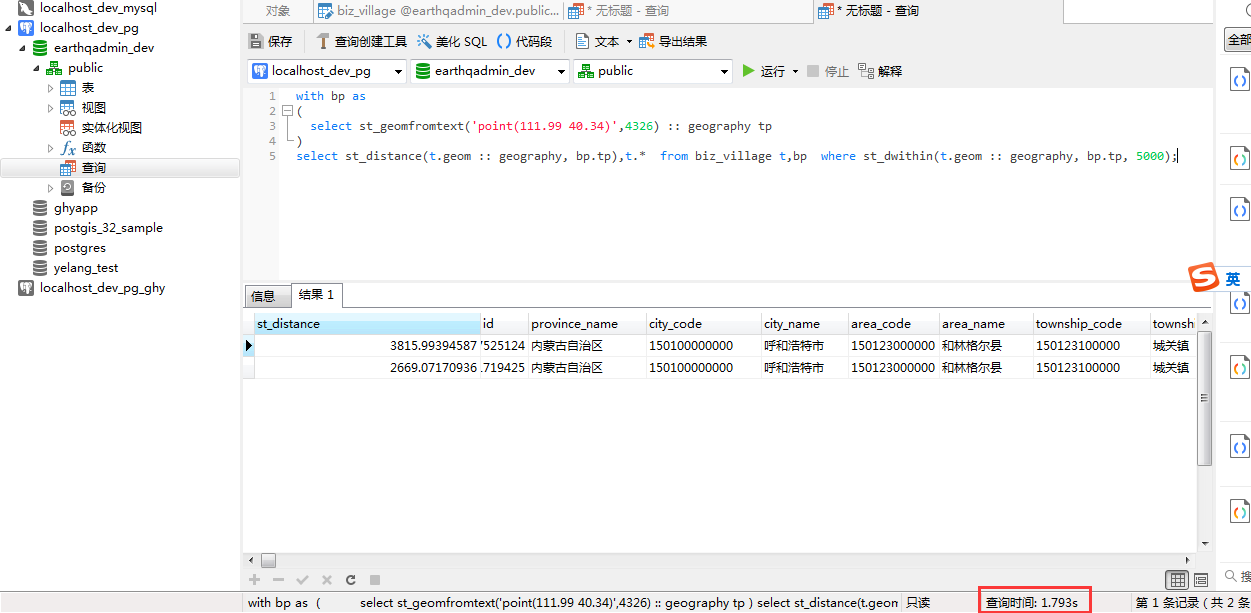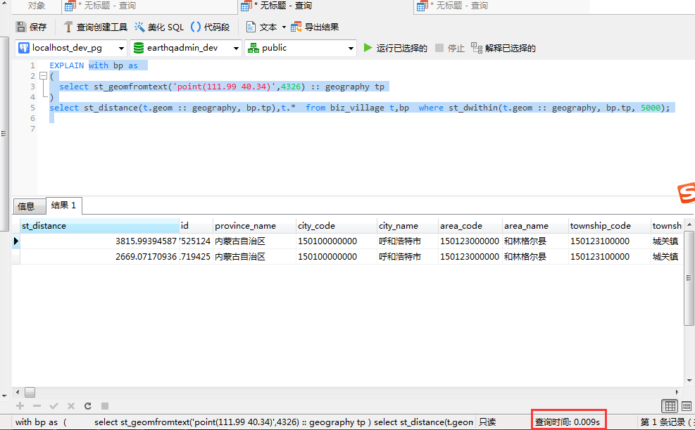 再次执行空间查询,效果依然很明显。优化后执行时间耗时0.009秒。
