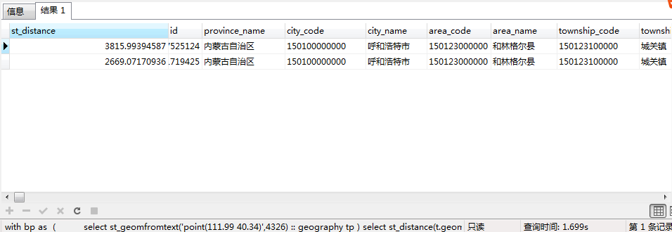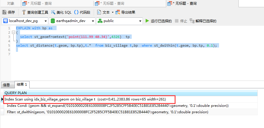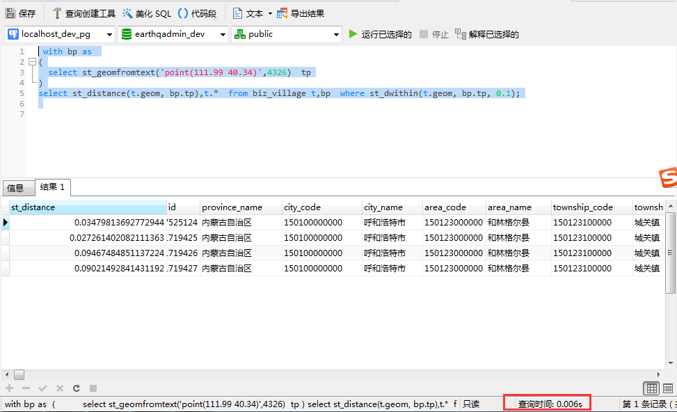 仔细对比一下之前的查询计划,发现这里用到了索引查询,0.1表示0.1度,并不是0.1米。请各位朋友注意。 再来执行以下sql语句,是不是很惊喜,查询时间只需要0.006秒。这说明空间索引的构建对于提升空间查询速度帮助很大。