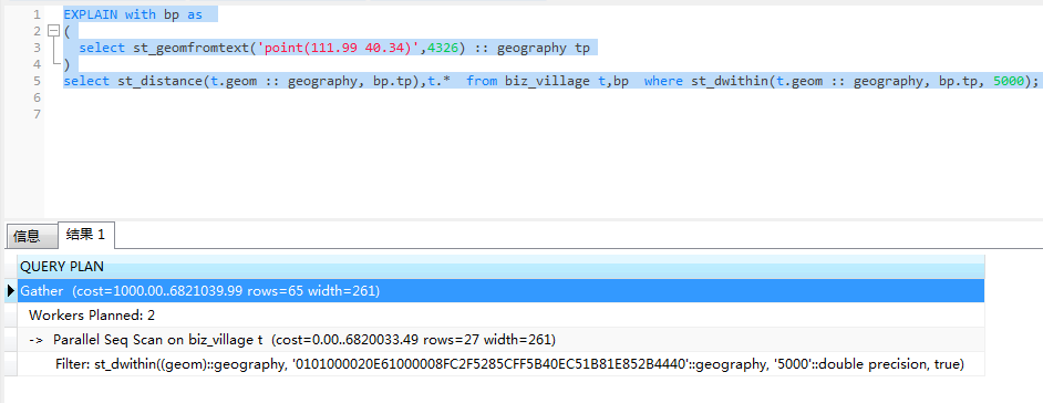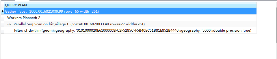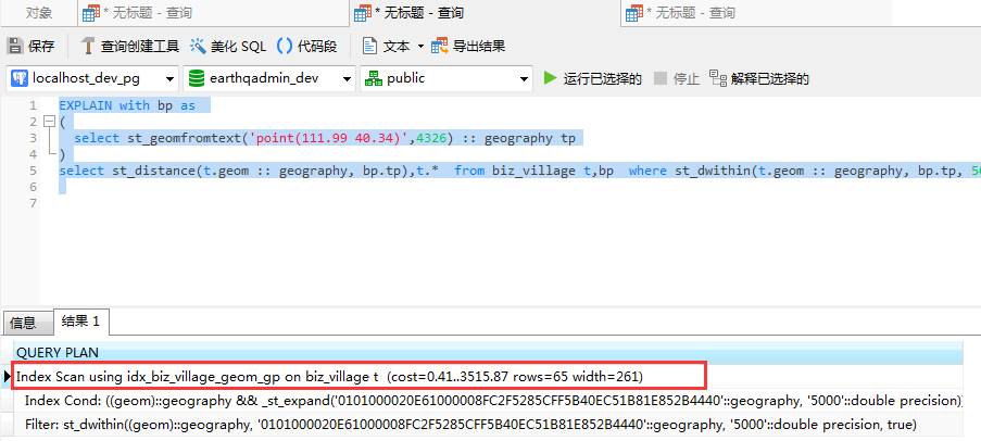 在st_dwithin函数中,我们把原本的geometry类型转换为了geography,之所以转换是因为我们想精确计算范围,比如5公里。众所周知,在4326坐标系下,如果使用geomerty的距离计算单位是度,而不是我们熟悉的米。我们先将转换去掉,先来验证索引是否有效。