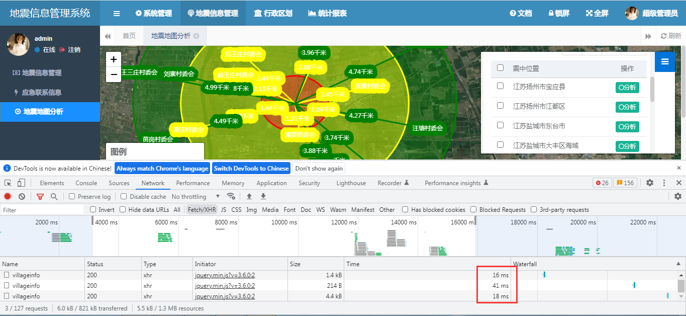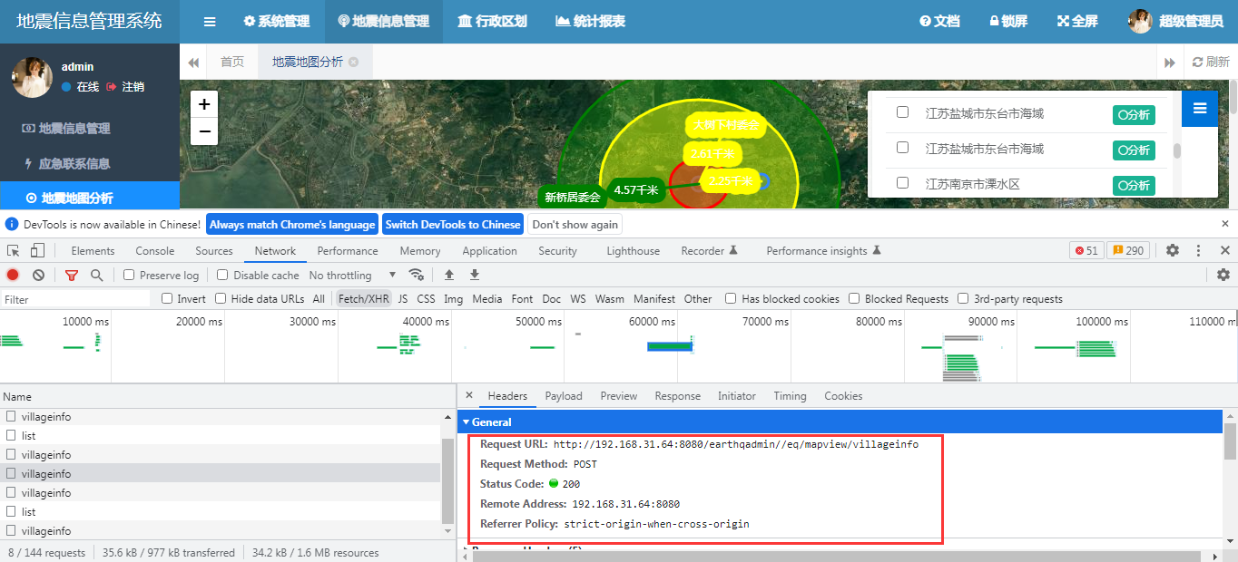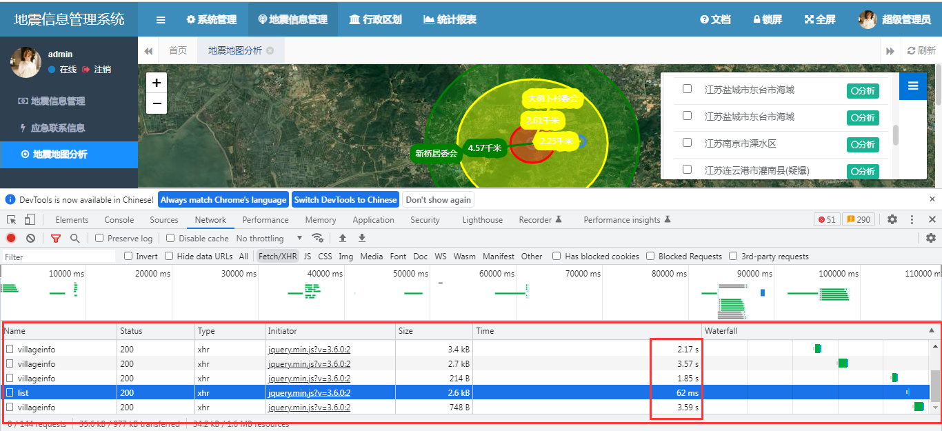 在这些应用的建设过程当中,在进行震中范围定位时,我们发现了一个问题,就是页面请求后端的时间比较长,界面要等很久才能获取结果。 下面是我们进行网络跟踪的结果。