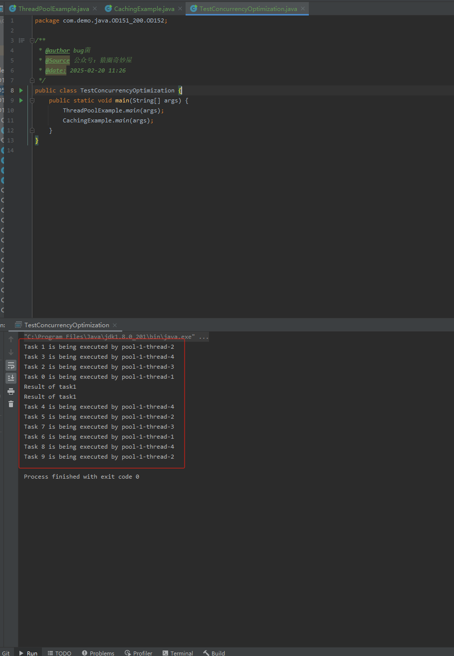 ThreadPoolExample.main(args)和CachingExample.main(args)被调用,分别执行线程池示例和缓存示例。- 这样两个示例将同时执行,测试在不同场景下的并发行为。