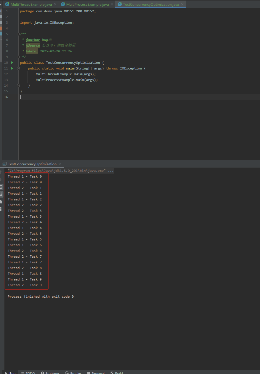 如上这段代码展示了如何在 Java 中实现并发和并行的两种方式:多线程 和 多进程。同时还提供了一个测试类 TestConcurrencyOptimization 来同时执行这两种方式。