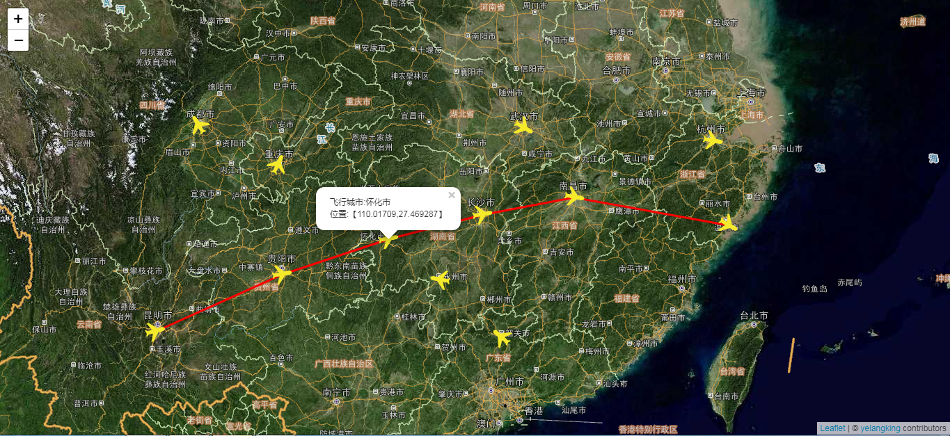 这里采用模拟数据的方式对位置和方位进行模拟,在实际项目中,如果可以接入实时位置,就可以实现动态位置和方位了。模拟数据包含两个部分,第一个是模拟一条飞行航线的所有点,代表是从【昆明】飞往【温州】的一条航线,另一个是实时的飞机位置和方位数据。