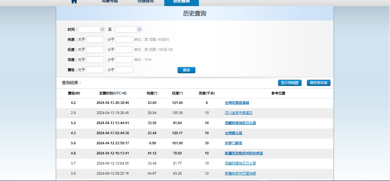 在地震历史中可以查询到近10年的地震信息,可以在官方网站中打开历史查询tab页。默认不输入任何条件,查询近期的地震信息。界面如下所示: