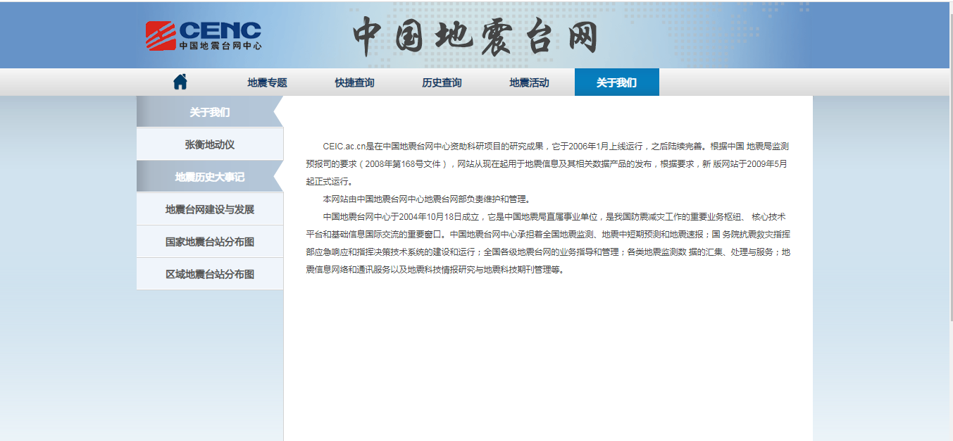 CEIC.ac.cn是在中国地震台网中心资助科研项目的研究成果,它于2006年1月上线运行,之后陆续完善。根据中国 地震局监测预报司的要求(2008年第168号文件),网站从现在起用于地震信息及其相关数据产品的发布,根据要求,新 版网站于2009年5月起正式运行。中国地震台网中心于2004年10月18日成立,它是中国地震局直属事业单位,是我国防震减灾工作的重要业务枢纽、 核心技术平台和基础信息国际交流的重要窗口。中国地震台网中心承担着全国地震监测、地震中短期预测和地震速报;国 务院抗震救灾指挥部应急响应和指挥决策技术系统的建设和运行;全国各级地震台网的业务指导和管理;各类地震监测数 据的汇集、处理与服务。