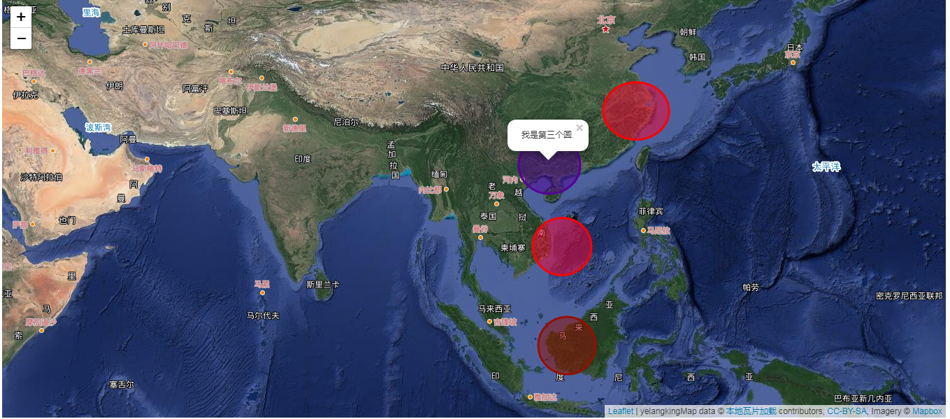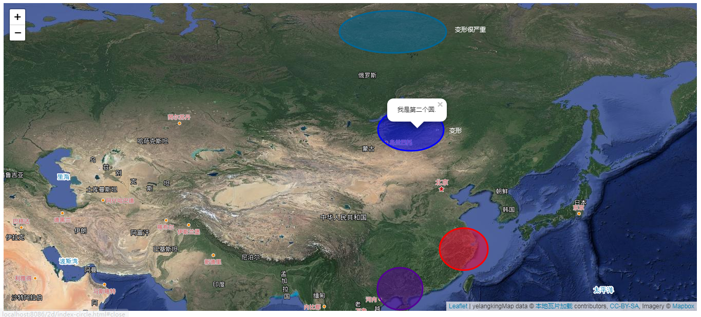 通过上述两种不同投影类型中对圆的加载和修正展示。相信大家对空间对象的展示已经比较清楚了。如果是经纬度投影,在中高纬度地区,空间信息会变形,如果需要按原始图形展示,需要自己修正。而采用Web墨卡托投影,则不需要做任何处理。