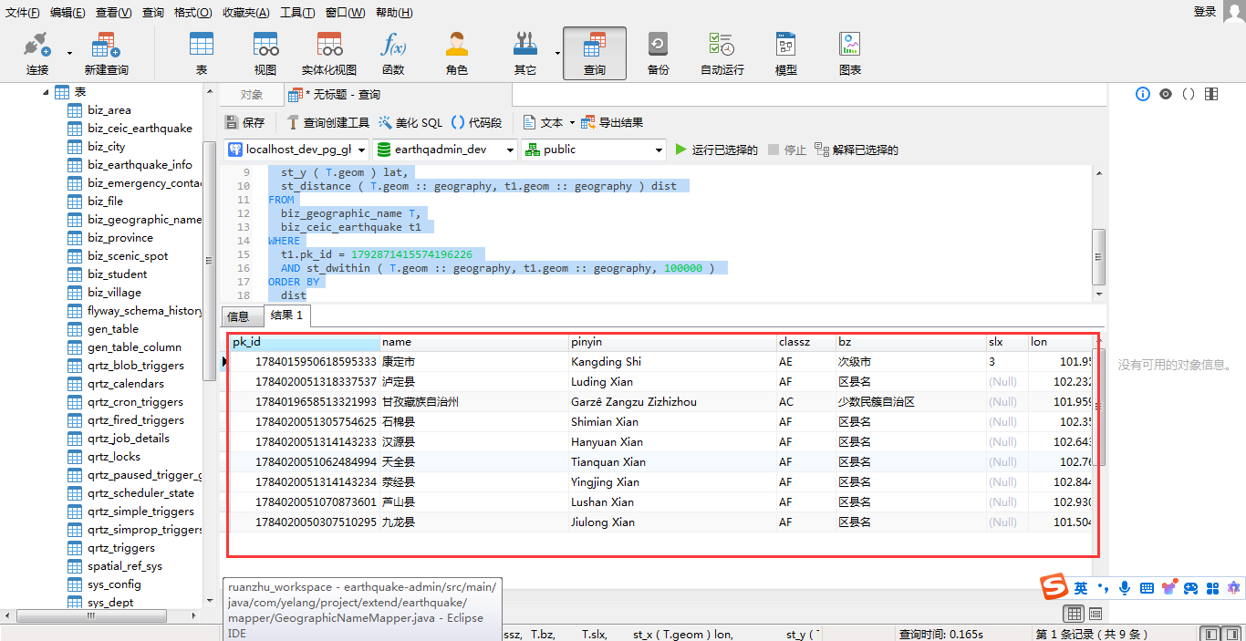 通过这条sql语句就可以实现对空间数据的分析。大家请注意,在数据库中我们将地震点存储为Geometry数据,而在界面上我们需要进行经纬度的还原,因此我们采用直接获取经纬度的方法,即:st_x ( T.geom ) lon,st_y ( T.geom ) lat