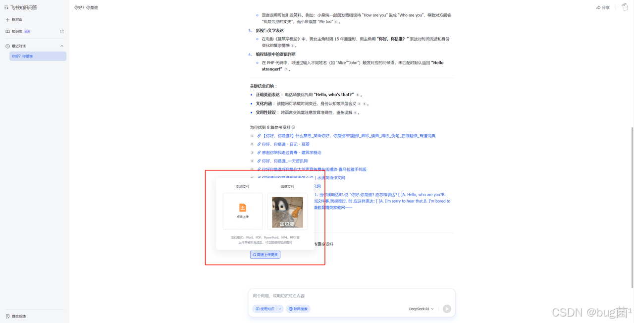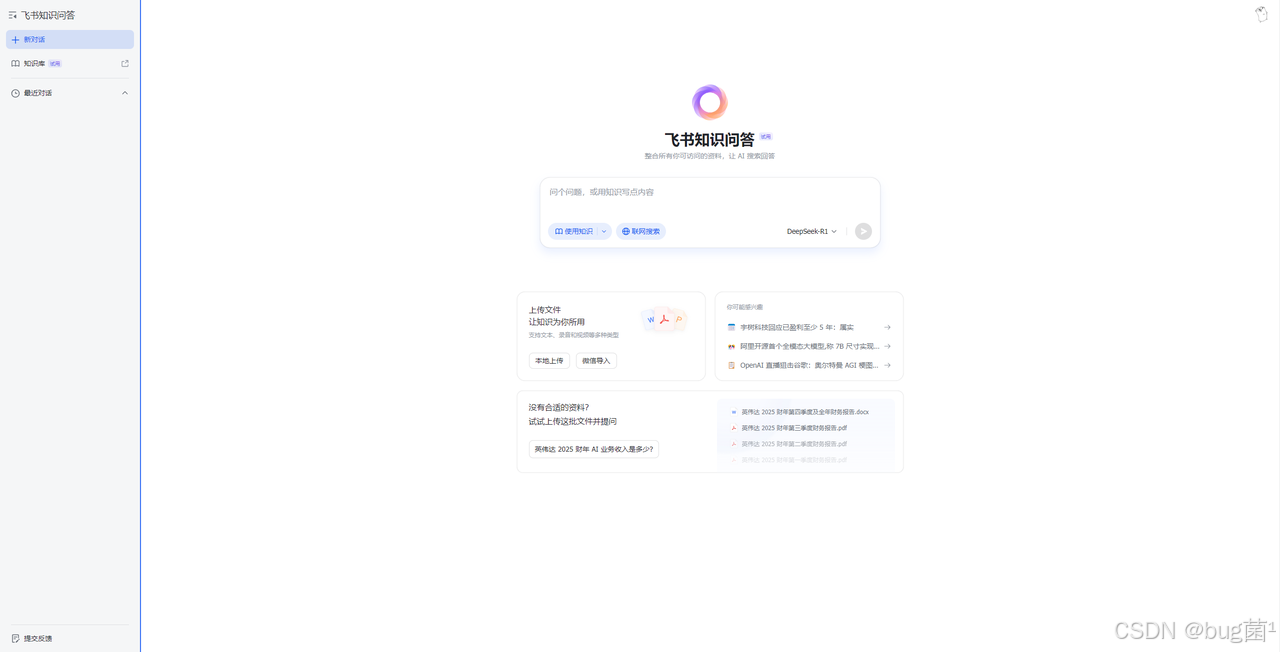飞书知识问答不仅支持基于关键词的问答,还能智能理解并提供与提问相关的细节信息。例如,管理者可以通过提问查看项目的最新进展,员工可以快速查询产品的工作流程,所有信息都能清晰地呈现出来,帮助员工做出更迅速的决策。比如这里我们可以搭建个人或部门知识库,只需要上传相关资料文件即可。