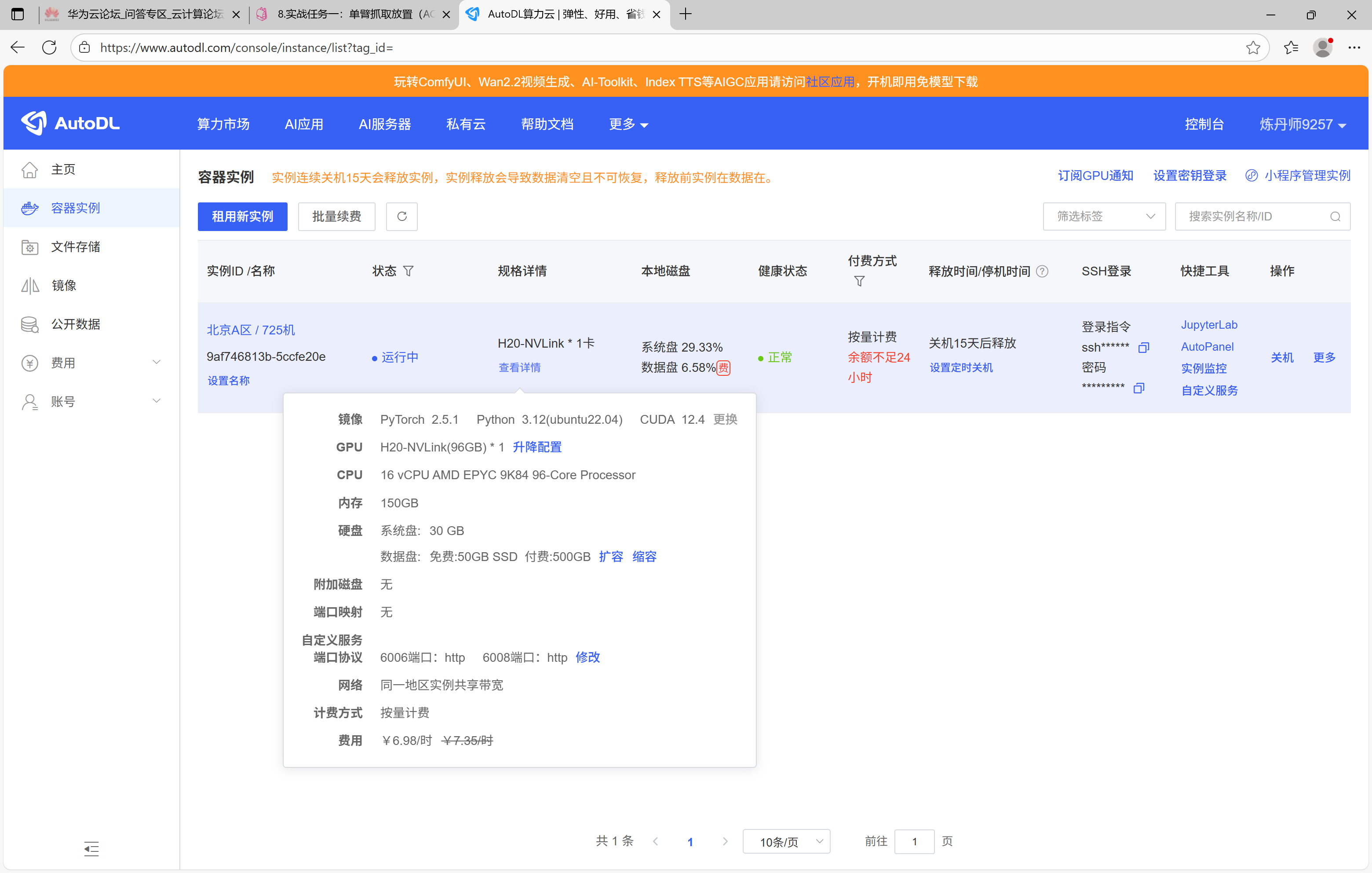 在LeRobot安装及使用教程的基础上,训练Pi0需要显存较大的显卡,我租赁的实例是 H20,使用VS Code SSH远程连接服务器: