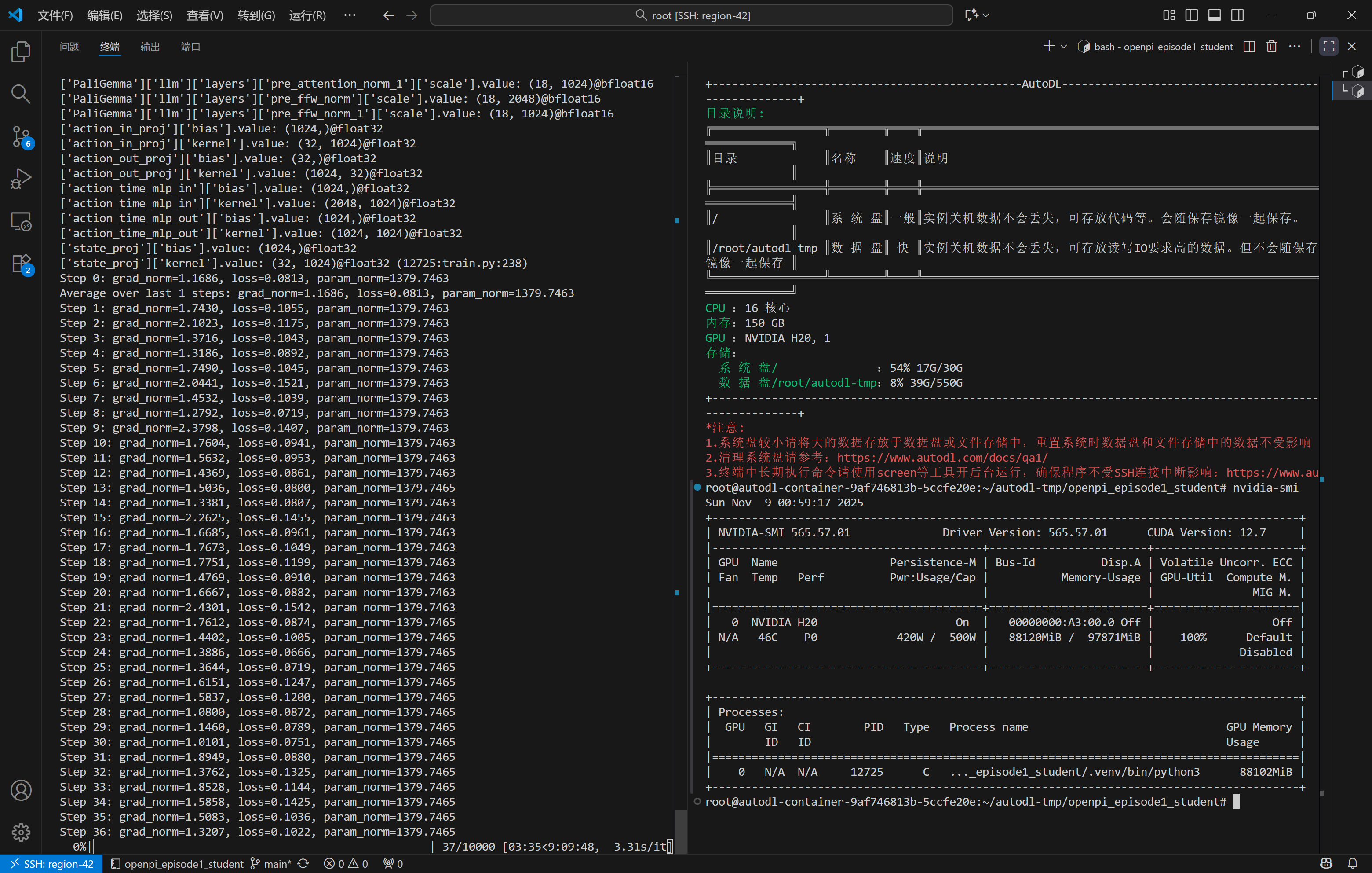 在训练过程中可以看到模型的LOSS在逐渐降低,也可以在终端中查看GPU的利用率,采集100个episodes数据使用H20迭代10_000步大概需要花费9个小时: