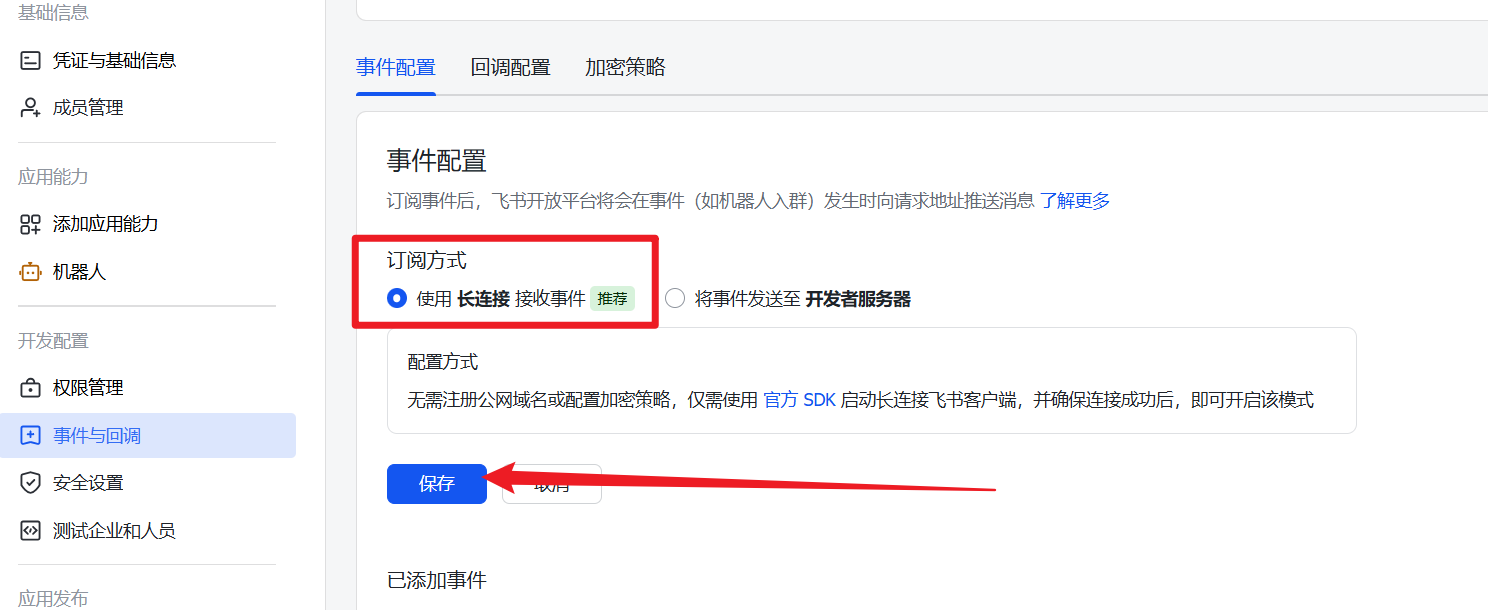 首先打开飞书后台管理,来到事件与回调, 点击添加事件