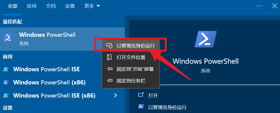 这里我就直接按 Win + Q 输入 powershell 回车,以管理员形式打开powershell