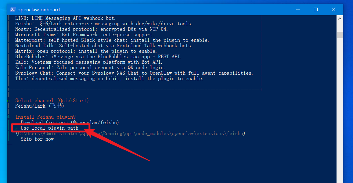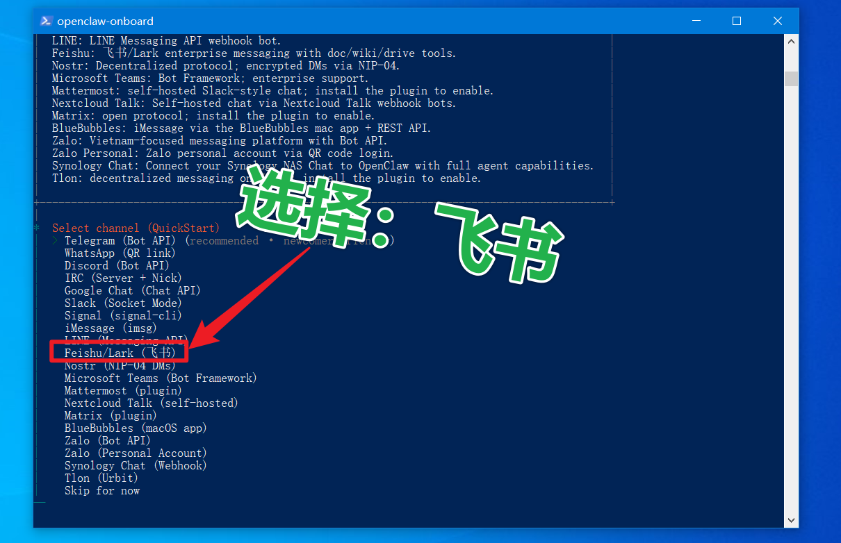 继续用方向键选中 Feishu/Lark(飞书)然后按回车确认,这是我们要对接的目标平台~