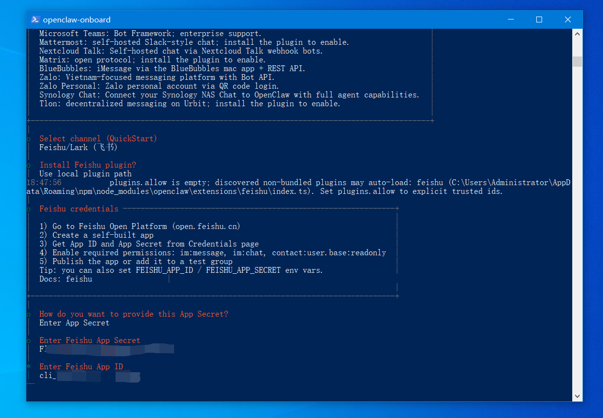 那是因为我们还没有去OpenClaw那边还没配置飞书的App ID和App Secret