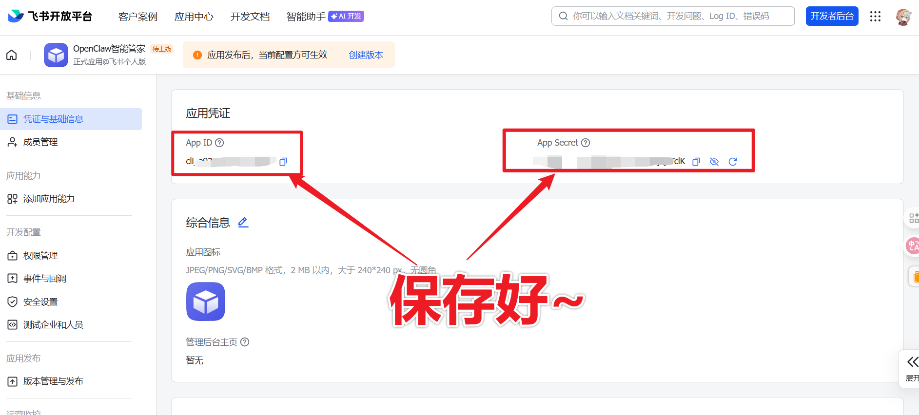 创建好之后,进入凭证与基础信息页面,我们就可以看到App ID和App Secret了