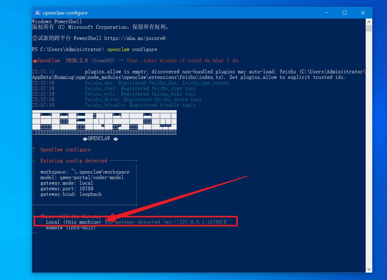 注意: 这个小黑屏窗口是 OpenClaw 的网关服务,必须保持打开才能让飞书机器人持续运行