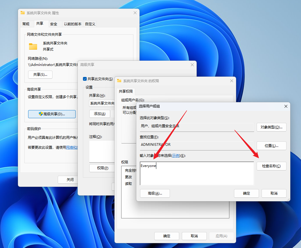 然后继续 点权限 — 添加 — 输入 Everyone
