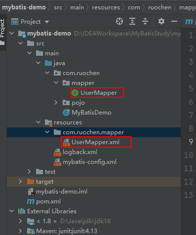 - 定义与SQL映射文件同名的Mapper接口,并且将Mapper接口和SQL映射文件放置在同一目录下