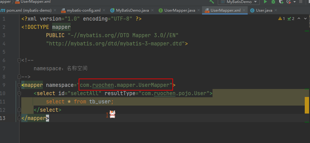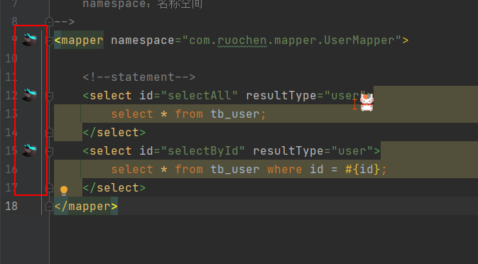 package com.ruochen.mapper; import com.ruochen.pojo.User; import java.util.List; public interface UserMapper { List<User> selectAll(); } - 编码测试