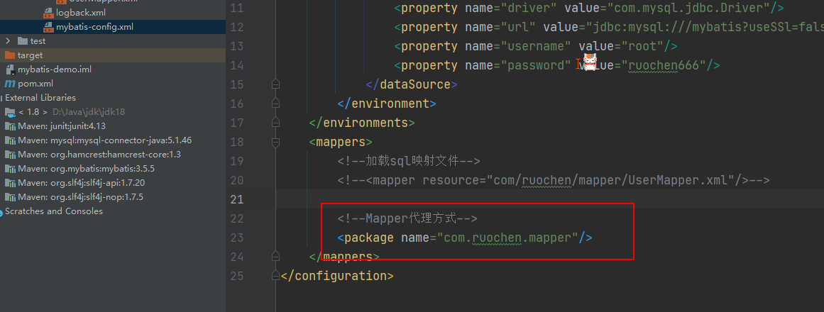 package com.ruochen; import com.ruochen.mapper.UserMapper; import com.ruochen.pojo.User; import org.apache.ibatis.io.Resources; import org.apache.ibatis.session.SqlSession; import org.apache.ibatis.session.SqlSessionFactory; import org.apache.ibatis.session.SqlSessionFactoryBuilder; import java.io.IOException; import java.io.InputStream; import java.util.List; /** * Mapper 代理开发 */ public class MyBatisDemo2 { public static void main(String[] args) throws IOException { // 1. 加载 MyBatis 的核心配置文件,获取 SqlSessionFactory String resource = "mybatis-config.xml"; InputStream inputStream = Resources.getResourceAsStream(resource); SqlSessionFactory sqlSessionFactory = new SqlSessionFactoryBuilder().build(inputStream); // 2. 获取 SqlSession 对象,用它来执行 sql SqlSession sqlSession = sqlSessionFactory.openSession(); // 3. 执行 sql 语句 // List<User> users = sqlSession.selectList("test.selectAll"); // 3.1 获取 UserMapper 接口的代理对象 UserMapper userMapper = sqlSession.getMapper(UserMapper.class); List<User> users = userMapper.selectAll(); System.out.println(users); // 4. 释放资源 sqlSession.close(); } }[User{id=1, username='zhangsan', password='123', gender='男', addr='北京'}, User{id=2, username='李四', password='234', gender='女', addr='天津'}, User{id=3, username='王五', password='11', gender='男', addr='西安'}, User{id=4, username='赵六', password='111', gender='女', addr='上海'}]