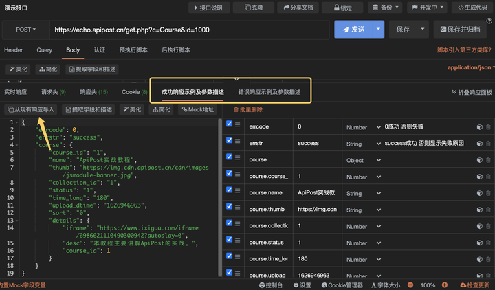 很多新手困惑为什么APIPOST分享的文档没有成功响应示例和错误响应示例,那是因为APIPOST不会把发送后的实时响应的数据作为响应示例。
