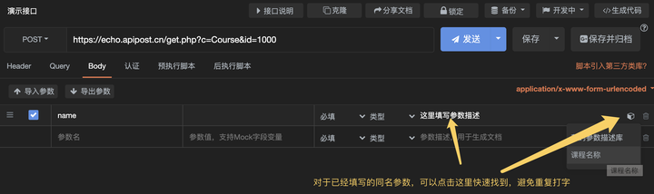 同样,对于已经填写过的参数,APIPOST会自动匹配描述,不用重复填写。