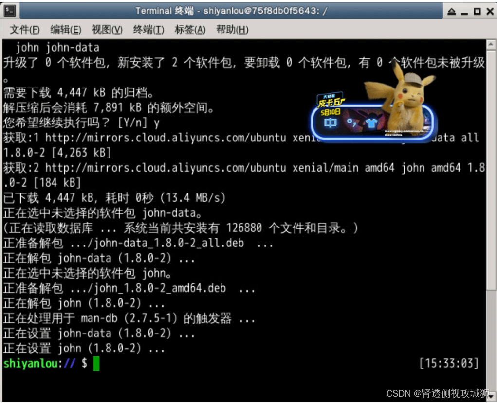 - 这就要使用到 hash 破解神器——john,该工具在 Kali 上是默认安装的,但在 ubuntu 上需要自己安装。