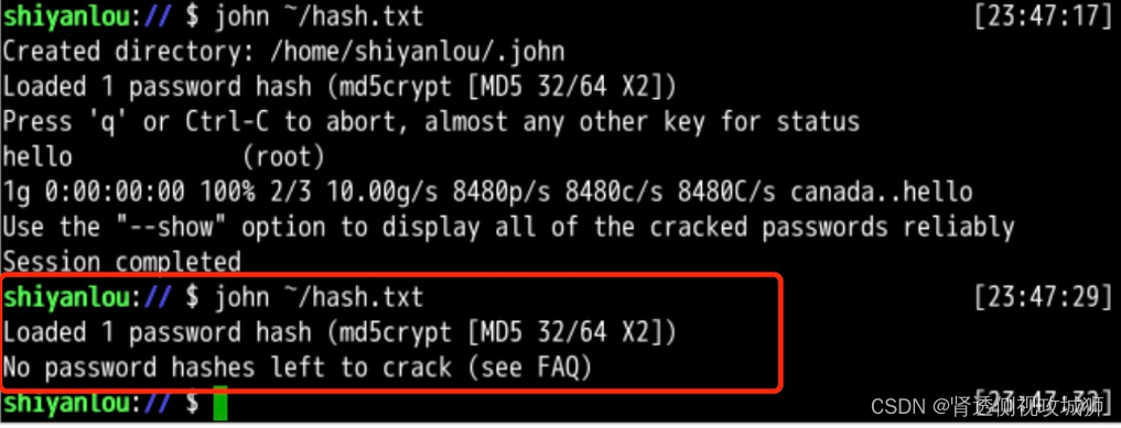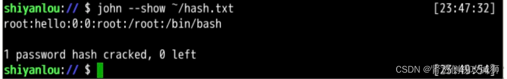- 如上图所示,john 成功破解出密码为 hello。(由于此实验中密码比较简单,故 john 破解速度非常快,实际环境中由于密码复杂度可能更高,破解时间会更长。)