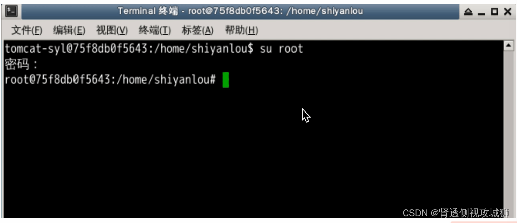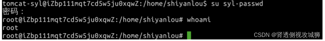 - 我们再回到 tomcat-syl 用户 shell 中,使用 su 命令切换到 root 用户(输入密码时,不会有显示):