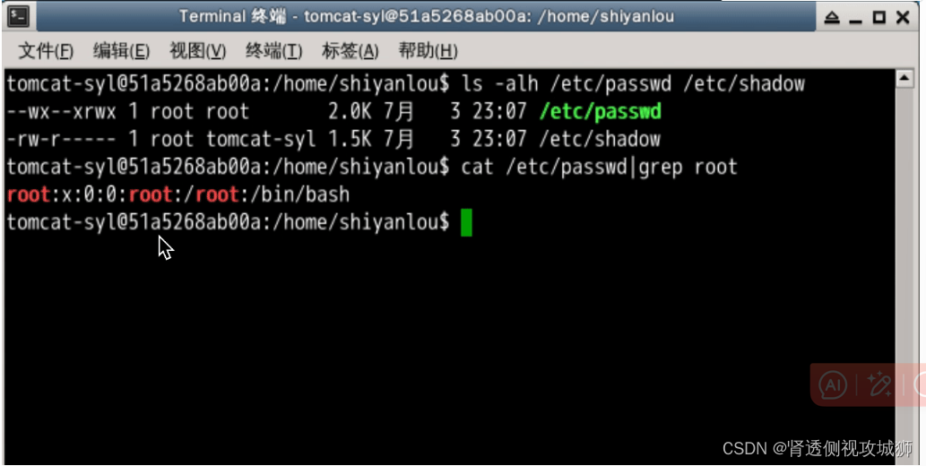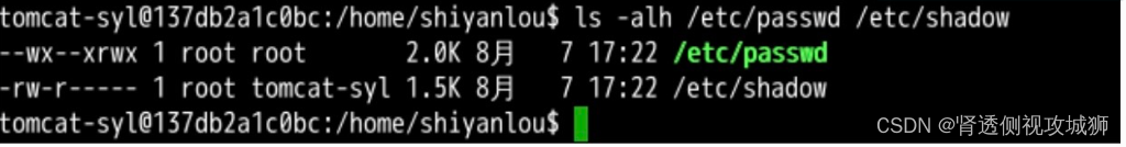 和之前一样,使用如下命令查看 /etc/passwd 和 /etc/shadow 文件的权限: