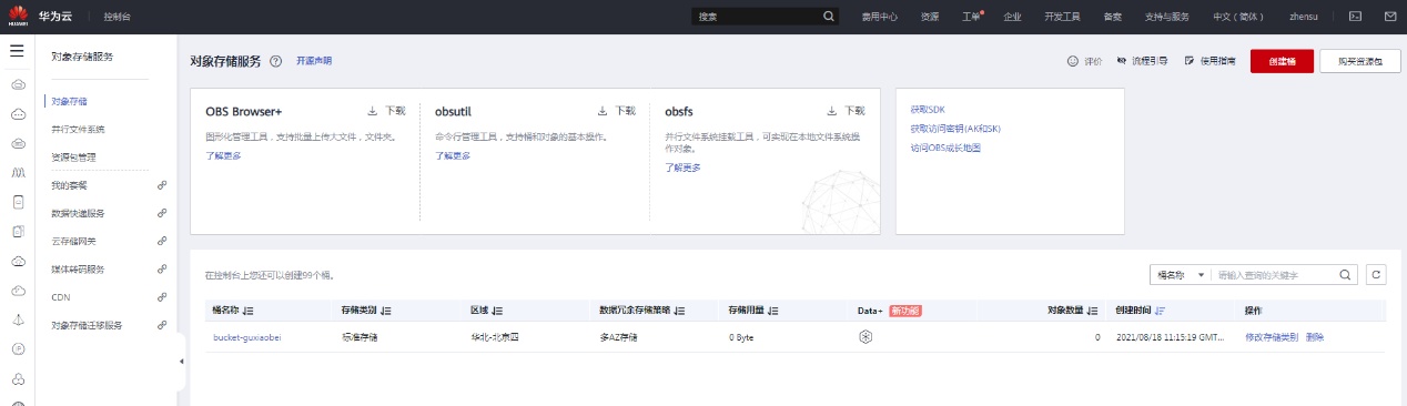 2、进入华为云的OBS服务,进入“管理控制台”。点击“创建桶”。  3、取个桶名字bucket-guxiaobei。  4、OBS桶创建成功。  5、点击桶名,可以查看OBS基本信息。可以看到我的OBS桶访问域名bucket-guxiaobei.obs.cn-north-4.myhuaweicloud.com