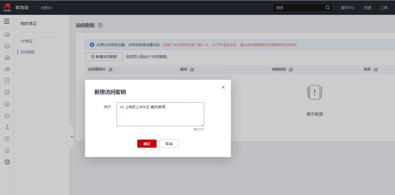 2、本文使用永久AK/SK。点击华为云用户名下的“我的凭证”。  (2)新增访问秘钥。  (3)创建成功后,点立即下载。  (4)打开excel文件,即可看到用户名下对应的AK/SK。