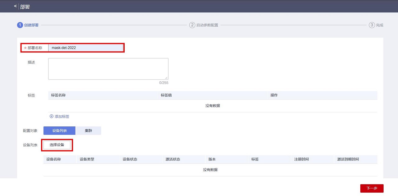 点击订单管理页面口罩检测技能后面的“部署”按钮,进入部署第一步“创建部署”页面,任意填写一个部署名称,点击“选择设备”按钮: