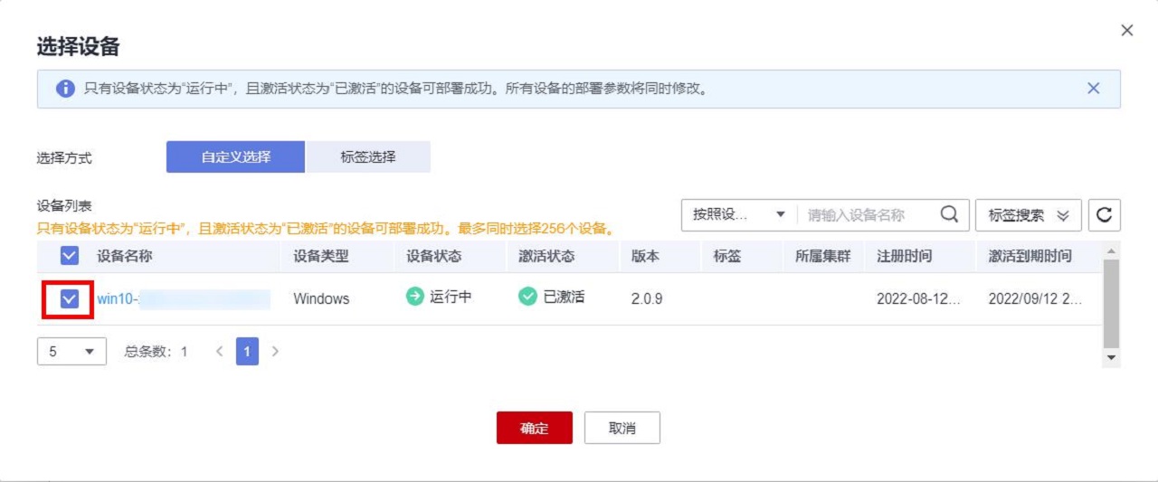 选择要部署的设备(只有“运行中”、“已激活”的设备可见),点击“确定”: